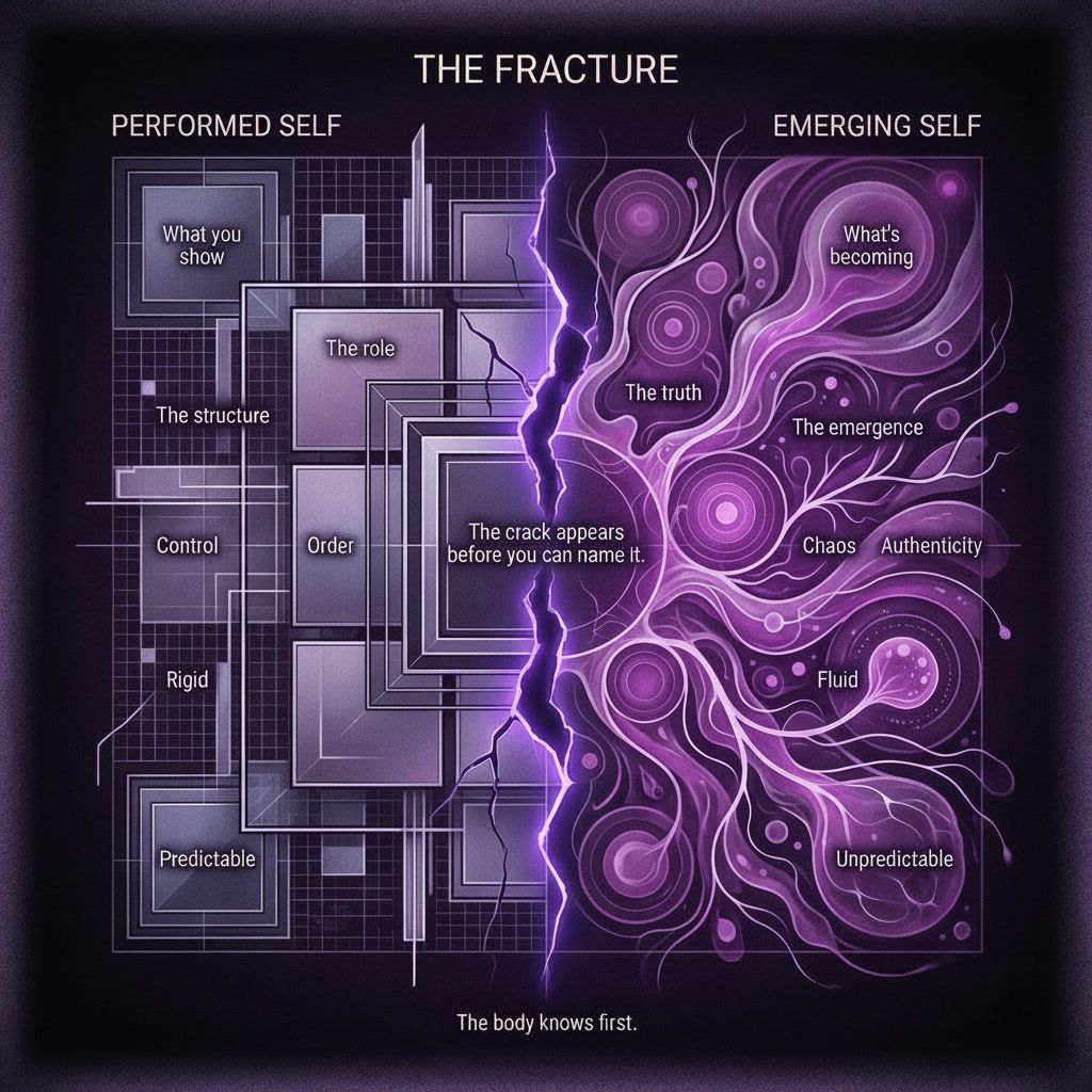 It starts with internal friction. Your body starts rejecting the identity you're performing. You feel it as tension, restlessness, a sense of wrongness you can't name.
