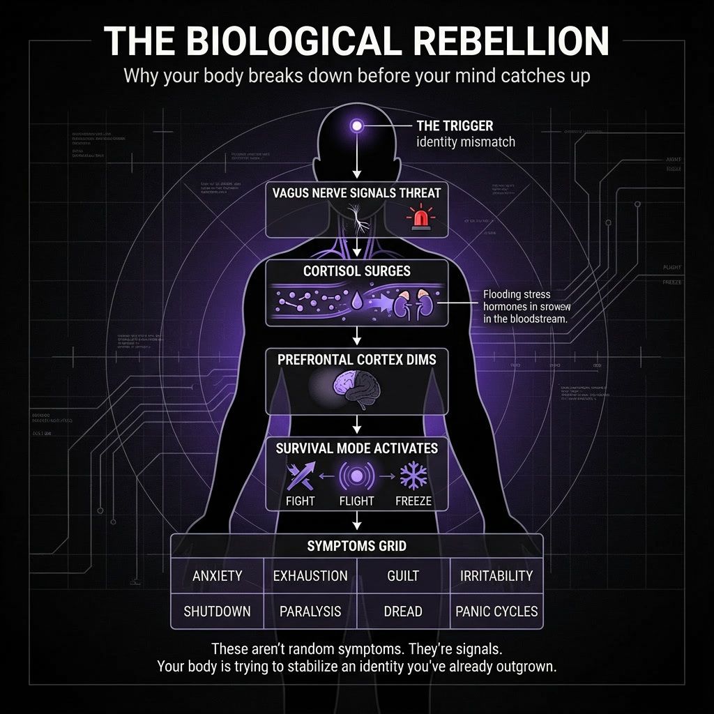Identity doesn't expire in thought first. It expires in the nervous system. When the identity you're performing no longer matches who you are in the process to become, the autonomic nervous system reads this mismatch as instability; a threat to internal coherence.